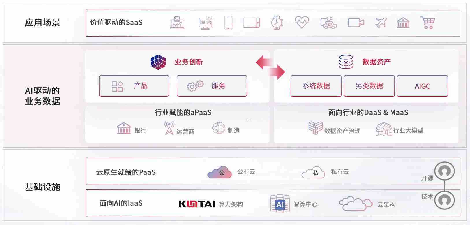 数字时代,,围绕企业数字化转型的关键要素,,,尊龙z6数码开创性的提出数云融合战略和技术体系框架,,着力在云原生、、、数字原生、、AI原生和信创产业上架构产品和服务能力,,,,为处在不同数字化转型阶段的快消零售、、、汽车、、、、金融、、、医疗、、政企、、教育、、、、运营商等行业客户提供泛在的敏捷IT能力和融合的数据驱动能力,,构建跨界融合创新的数字业务场景和新业务模式,,,,助力企业级客户建立面向未来的核心能力和竞争优势,,全面推动社会的数字化、、智能化转型升级。。
