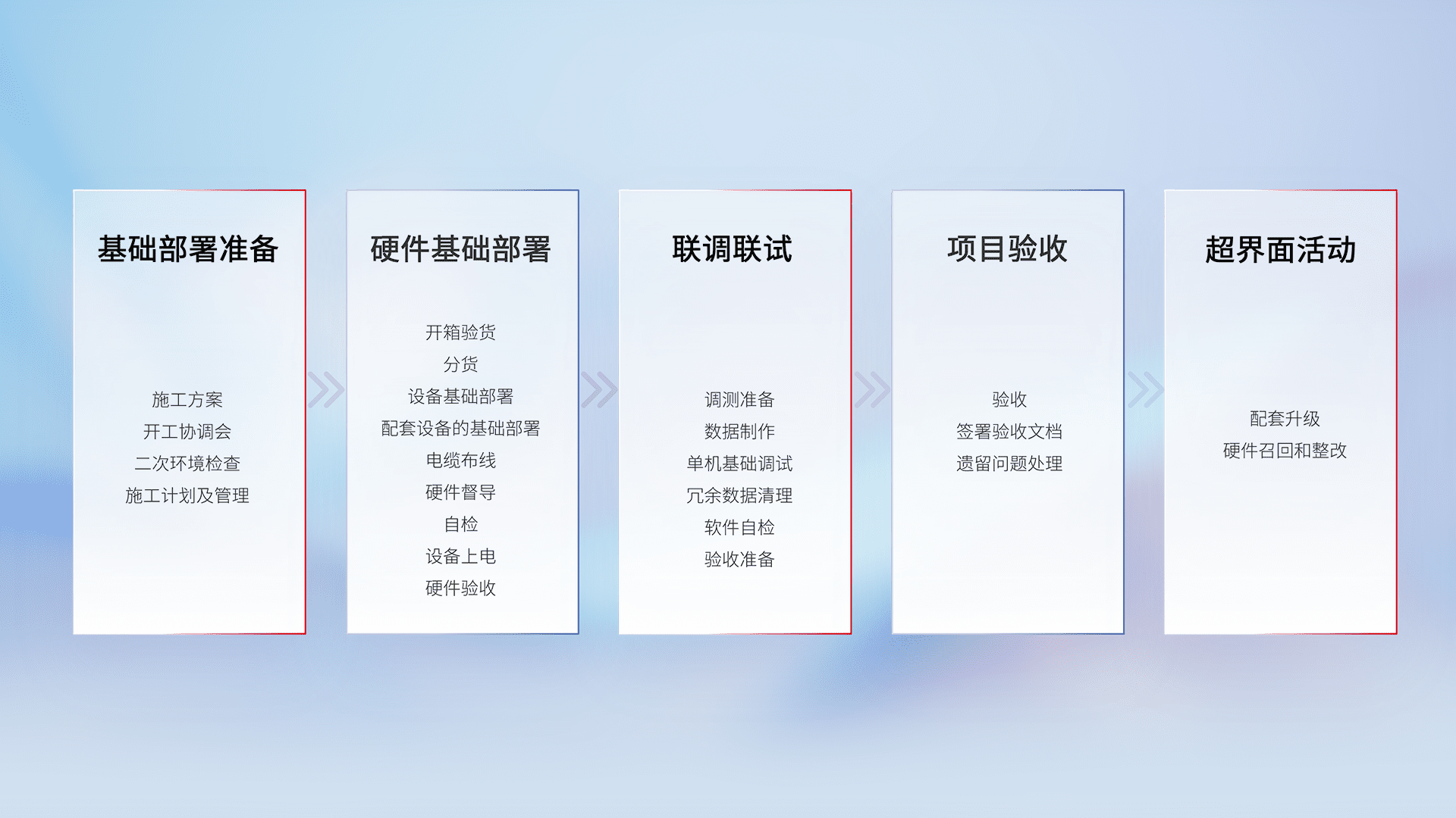 从基础部署准备、、硬件基础部署、、联调联试、、、项目验收、、、、越界面活动的全过程可追溯,,保证施工质量和进度。。。。